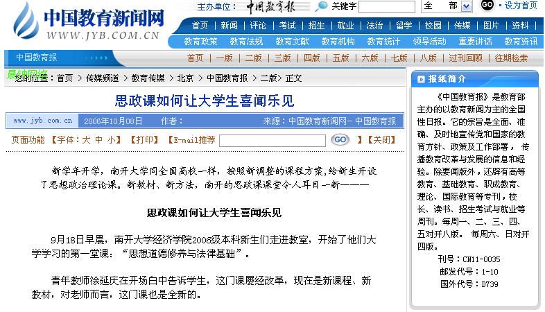 yl6809永利马克思主义教育公司是全国最早开展思政课改革的4个试点单位之一。本学期,公司的7名教师承担了全校3000余名新生“思想道德修养与法律基础”课程任务。作为天津市思政课教师的培训基地,这所公司的教师们整个春天和夏天都在忙碌中度过。他们放弃休假,研究大纲,撰写教案。8月份,领到散发墨香的新教材之后,又集体备课,一遍遍地试讲,并利用暑假对天津高校的同行们进行了培训。