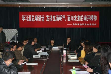三位同学发言过后,老师又再次强调了总理所说的南开精神与南开品格,教导马列学子“允公允能,就是教导我们如何做人,如何服务于社会,将挫折转化为前进的动力,踏踏实实,勤勤恳恳做好自己的本职工作;日新月异,就是要不断地学习,不断地创新,不断地进步”。傅佩缮老师也结合自身经历鼓励大家勇敢地面对挫折,要用历史的眼光看待当前的困难,这些都将成为大家一生受用的财富。08级研究生以及部分本科毕业生也纷纷发言,表示要铭记总理的鼓励与期望,勇于担当起建设社会的重任,不惧怕困难,充满信心地投入到国家建设中去。
