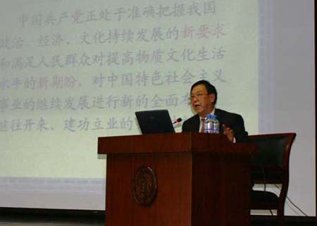 赵经理在时长两个小时的报告会中用幽默风趣、通俗易懂的语言,分别从中华民族伟大复兴的历史进程、全面发展中国特色社会主义事业的机遇与挑战、马克思主义中国化的历史进程三个大的方面详细阐述了科学发展观的重大意义。接下来,他用形象的“坐标系”给中国所处的历史阶段进行定位,从时间坐标上看,中国由鸦片战争到现在,逐渐走向现代化,也正逐渐实现中华民族的伟大复兴;从空间坐标来看,中国的发展水平与发达国家还有巨大差距,并面临新兴发展中国家的强势追赶,科学发展时不我待;从思想坐标来看,我们必须坚持中国特色社会主义,与两种错误倾向作斗争,不能否定改革,更不能放弃党的领导。他指出:以胡锦涛为总书记的党中央站在时代高度,根据世情、国情、党情的发展变化,坚持了党的三代领导集体关于发展的重要理念,又深入总结国内外在发展问题上的经验教训,科学分析我国发展进程中面临的各种新情况新问题,提出了“科学发展观”的重要发展战略。科学发展观不仅是国家经济社会发展的重要战略,更是我们日常生活、学习的重要指导思想,他鼓励师生在各方面都要努力践行科学发展观,使科学发展观真正落到实处。