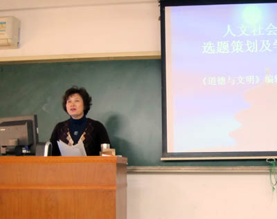 (通讯员:王倩倩)1125下午,中国名刊《道德与文明》主编、天津社会科公司研究员杨义芹老师做客南开马列公司,以“人文社会科学选题策划及学术规范”为题为大家做了精彩讲座。公司研究生辅导员袁婧老师及硕士、博士研究生参加了此次讲座。