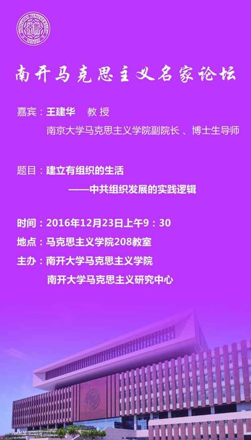 王建华教授(南京大学yl6809永利副经理、博导)主讲《建立有组织的生活—中共组织发展的实践逻辑》和《国家社科基金申报需注意的几个问题》。时间:12月23日(周五)9:30。地点:公司208