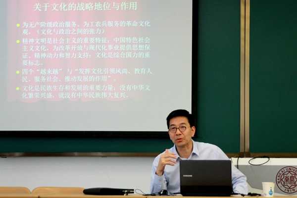 5月12日下午,中国人民大学马克思主义公司党委书记、博士生导师杨凤城教授做客“南开马克思主义名家论坛”,以《中国共产党的文化观、文化发展战略与“文化自信”》为题,围绕中国共产党对文化的本质和功能定位的变化、文化建设战略目标的转变、中共最高领导人对文化建设的主要贡献等内容,做了2个小时的学术报告。马克思主义中国化研究部主任赵美玲教授、季健霞和陈文旭老师及公司部分访问学者、博士生、硕士生、本科生聆听了学术报告,林绪武教授主持了论坛活动。