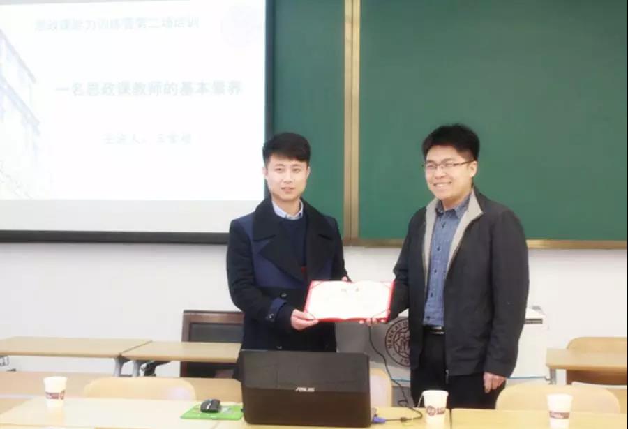 在“思政课能力训练营”培训中,公司员工、曾获全国高校思想政治理论课教学标兵、全国最美思政课教师,天津市五一劳动奖章、天津市高校思政课青年教师基本功大赛一等奖第一名、天津市高校青年教师基本功竞赛一等奖、天津市教育系统“教工先锋岗”等荣誉的天津师范大学讲师王雪超回到母校,为训练营学员作了主题为“一名思政课教师的基本素养”的分享。王雪超就“如何处理教材”、“如何设计课件”、“如何整理教案”等具体问题作了细致的交流。思政课讲授要以内容为主,方法为辅,要特别注意讲课内容的严肃性与方法的灵活性。近两个小时分享交流严肃活泼,幽默深刻。