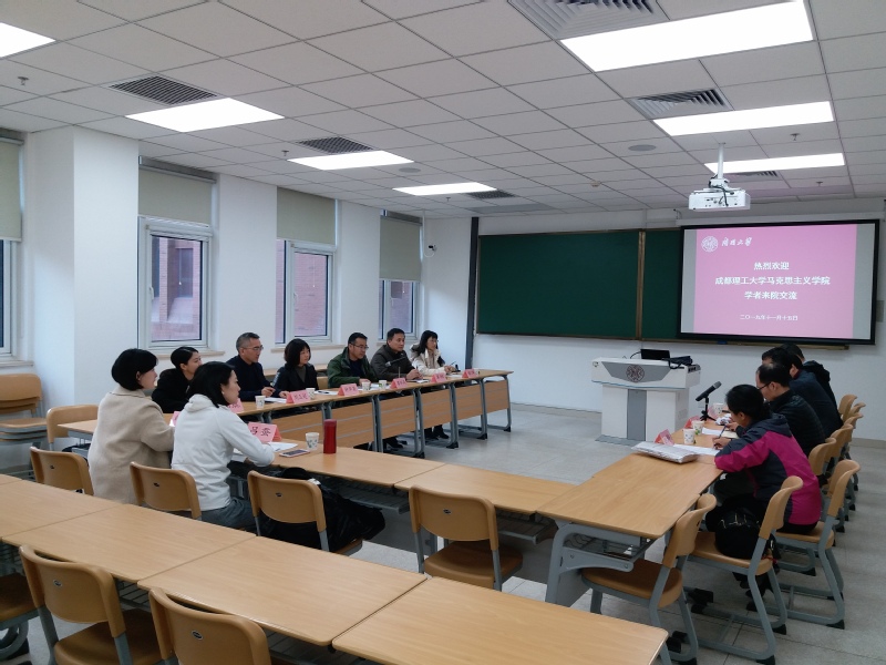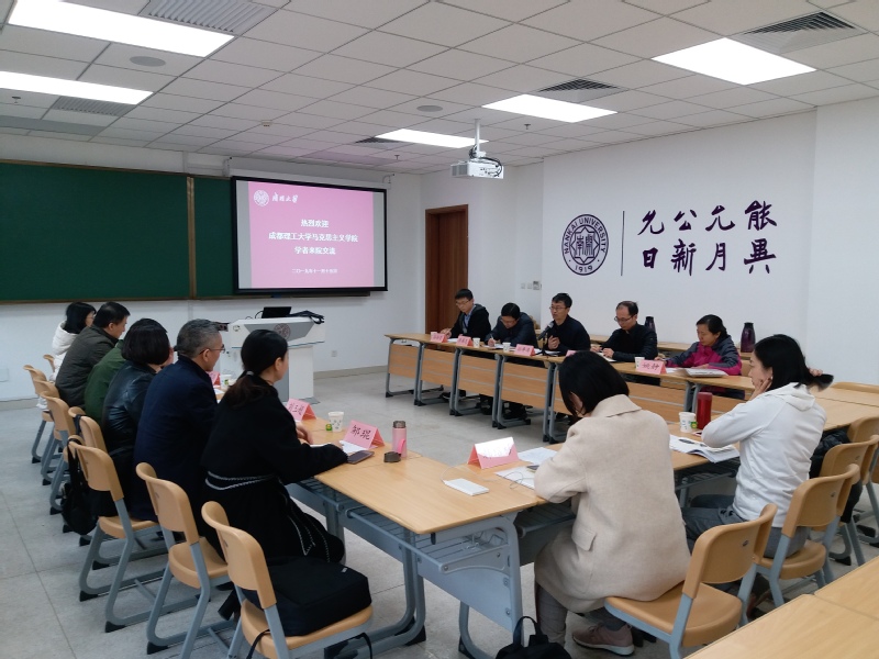 11月15日,成都理工大学yl6809永利思政理论与实践教学中心副主任廖怀高、本科思政教学部主任辜帆一行8人来公司交流。公司孙寿涛副经理主持了座谈会,本科教学部主任余一凡、纲要教研室李国忠、基础教研室姚静、概论教研室孙炳炎等教师参加了座谈会。
