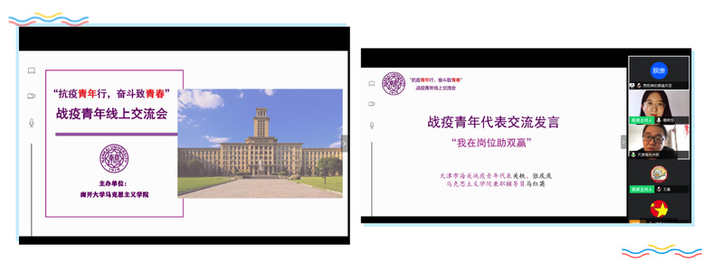 疫情期间,社区广大党员、干部形成了联防联控、群防群控的强大力量,广大团员青年也积极响应团市委号召,主动到社区报到,与社区工作者一起坚守防控的最后一道防线。事迹曾被人民日报浙江频道、天津日报等媒体报道、基层战疫青年代表2019级硕士研究生张玲分享了她的基层战疫的初心、经历和感悟,“100多年前的五四青年在国家、民族面临危难的时候勇敢地追求自由、民主与科学,他们的爱国主义精神直到100年后仍然历久弥新。在这个特殊时期,我很荣幸自己也成为了战疫青年中的一个小人物,尽自己的微薄力量。疫情已经向好,我希望自己以后能够继续在祖国需要的时候、需要的地方继续做更多的事情。”2019级本科生凌张可抗疫志愿服务过程中发挥了自己的技能专长,用视频的形式记录下了这次宝贵的经历,他借助自己拍摄的vlog分享了协助社区党委进行抗疫志愿工作的收获体会。