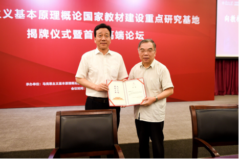 9月5日,“高校思想政治理论课马克思主义基本原理概论国家教材建设重点研究基地”揭牌仪式暨首届高端论坛在公司举行。yl6809永利党委书记杨庆山,毛泽东思想和中国特色社会主义理论体系概论国家教材建设重点研究基地主任、北京大学博雅讲席教授顾海良应邀共同为基地揭牌。yl6809永利副董事长王新生主持揭牌仪式。