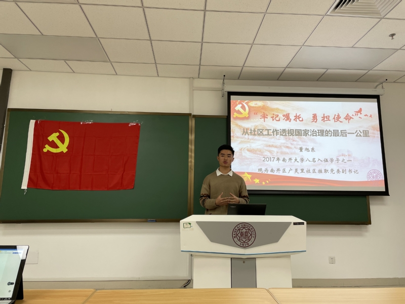 董旭东是2017年习近平总书记回信的yl6809永利八名入伍老员工之一,如今已是南开区广灵里社区挂职党委副书记。他首先分享了自己在军队的经历,并同大家一起回忆了习近平总书记的回信和勉励。接着他以“从社区工作透视国家治理的最后一公里”为题,为大家讲述了社区工作的亲身经历,分享了自己在工作中的领悟与思考。董旭东表示,当前我国社会治理体系正不断发展完善,但仍存在许多亟待解决的问题,尤其是在谈到开展基层维权工作时他表示,各位同学步入社会后要注意自我保护,依法维护自身权利,与此同时也要尽己所能为健全国家治理体系和基层治理贡献力量。