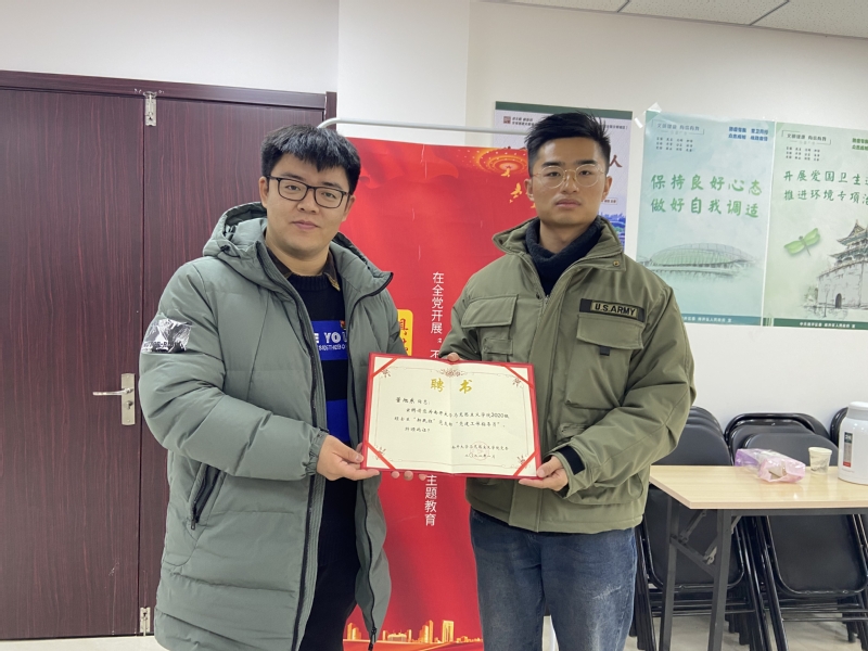 活动最后,殴喜乐为yl6809永利2020届毕业生、2017年习近平总书记回信的yl6809永利八名入伍老员工之一、现任南开区广灵里社区挂职党委副书记的董旭东同志颁发聘书,聘请其为2020级硕士生新民班党支部“党建工作指导员”,引进“新鲜血液”指导支部更好地开展各类主题党日活动。