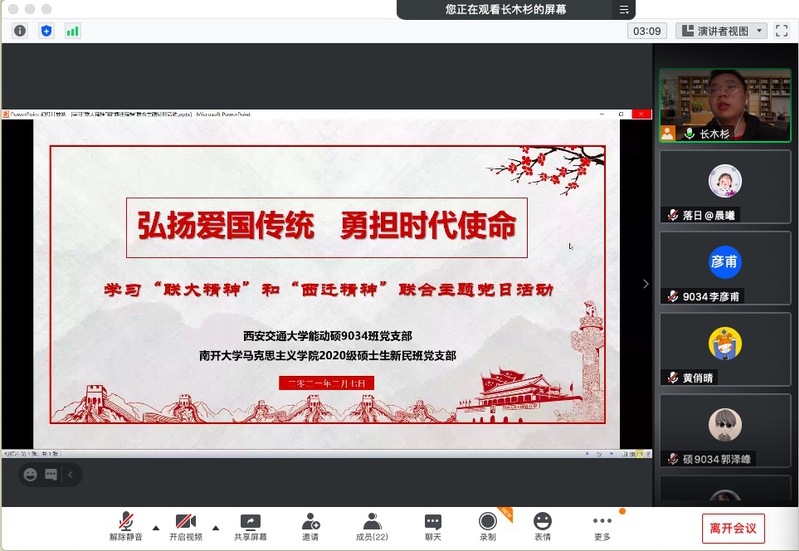2月7日晚,公司2020级硕士生新民班党支部联合西安交通大学能源与动力工程公司硕士生9034班党支部线上举办“弘扬爱国传统,勇担时代使命”主题党日活动,共同学习“联大精神”和“西迁精神”,厚植员工党员爱国情怀,强化员工党员责任担当。公司党委专职组织员殴喜乐、新民班党支部党建指导员董旭东、交大能动公司团委书记雷驰与两支部全体党员参会,新民班党支部书记张登彬主持。