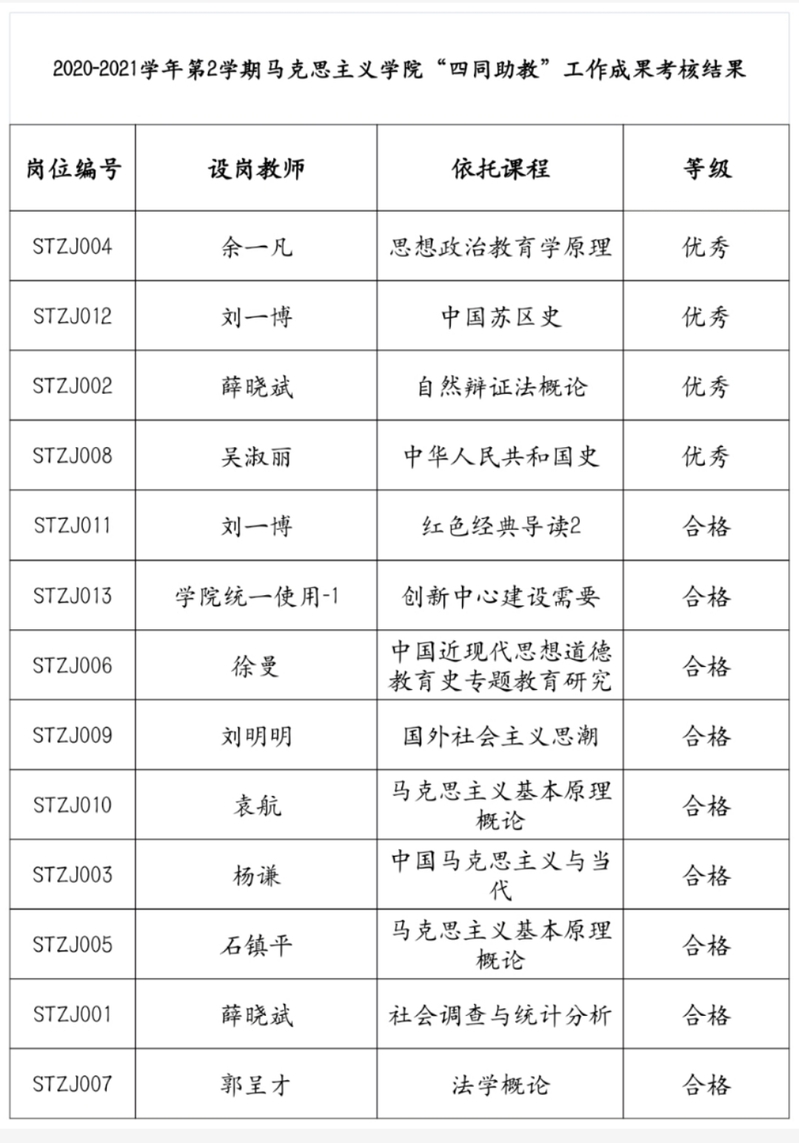 2020-2021学年第2学期yl6809永利“四同助教”工作成果考核结果