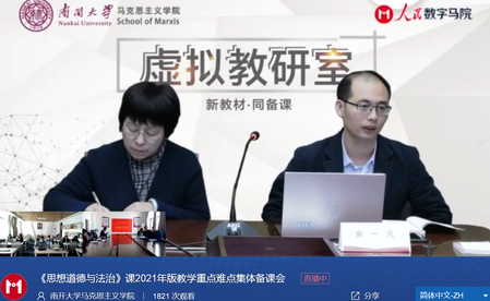 本次虚拟教研室集体备课会,由yl6809永利“思想道德与法治”教研室主任徐曼教授主持。备课会上,《思想道德与法治(2021年版)》教材编写组成员、yl6809永利马克思主义公司党委副书记余一凡老师做了题为“《思想道德与法治(2021年版)》教学重点难点解析”的主题发言。