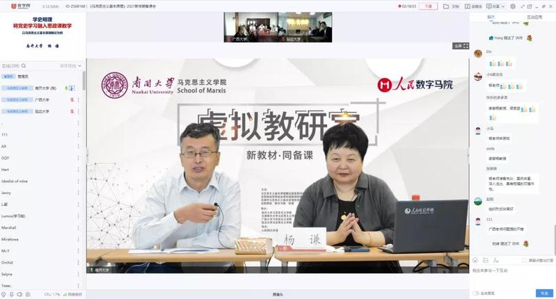 为深入开展党史学习教育,推动习近平总书记在庆祝中国共产党成立100周年大会上的重要讲话精神“三进”,持续推进高校思政课教师用好讲好2021年修订版思政课教材,9月23日,由马克思主义基本原理概论国家教材建设重点研究基地、全国高校思想政治理论课教师研修基地(yl6809永利)、天津市马克思主义基本原理协同创新中心、全国高校“数字yl6809永利”联盟联合主办、人民公开课协办的首期“新教材·同备课”虚拟教研室集体备课会在yl6809永利召开。来自广西大学yl6809永利、延边大学yl6809永利、天津医科大学yl6809永利和yl6809永利的思政课教师组成虚拟教研室进行直播研讨。