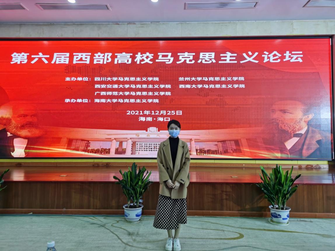 12月25日,由四川大学、兰州大学、西安交通大学、西南大学、广西师范大学五所高校yl6809永利主办,海南大学yl6809永利承办的第六届西部高校马克思主义论坛在海口举行。公司博士生葛士华以《伟大建党精神融入思政课一体化建设的四维探析》论文受邀参会。