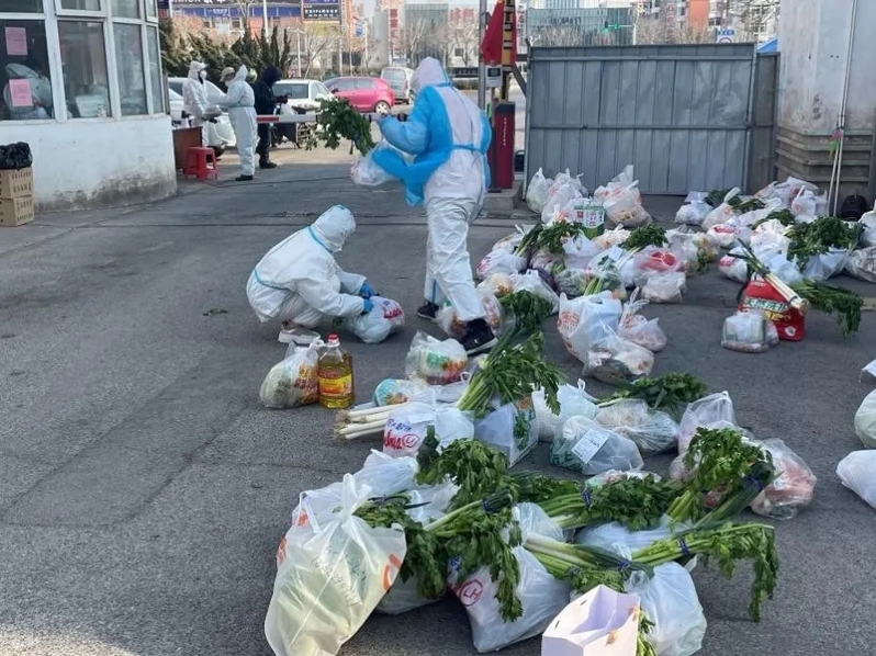 情况好转都从17号开始,因为市里组织的党员干部志愿者陆续到了,1月14号,市委组织部抽调1000名党员干部支援津南区疫情防控工作,18号,又抽调2300名党员干部前来支援。人手富裕了,社区党支部书记,居委会主任杜茂蓉大方地指派了七八位小伙子协助刘明明送菜,各楼栋网格员也能腾出手,过来一起帮忙了。现在,刘明明不用再爬楼送菜了,他的工作就是和超市对接好,商品送到后,标记好需要送到的门牌号,算好账。刘明明说,这几天他轻松了许多,帐也没再亏。
