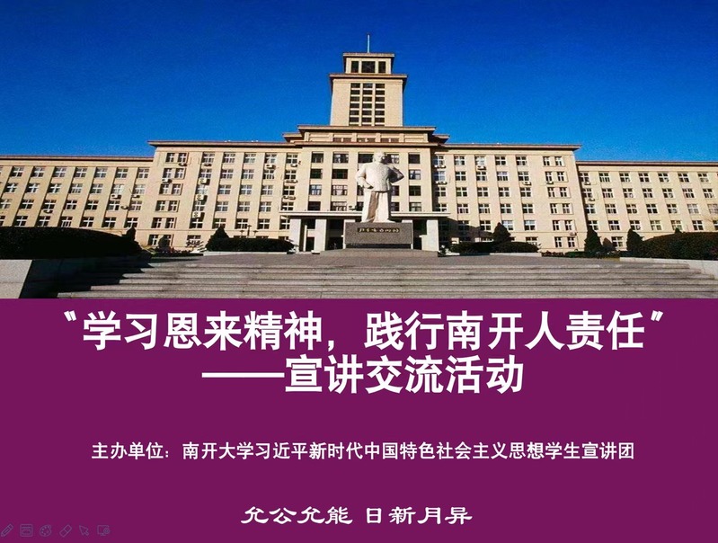 公司发挥员工积极参与宣讲的优势,号召同学们在宣讲中深刻认识和领悟周恩来精神,积极将所学所思所悟转化成实践的强大动力。4月3日至5日,yl6809永利习近平新时代中国特色社会主义思想员工宣讲团开展了系列主题活动。宣讲团进行了以“学恩来精神,践行南开人责任”为主题的内部交流。宣讲团成员、2021级硕士研究生李怡陶为yl6809永利药公司2020级硕士生党支部、药公司国重党支部45名同学做“大贤秉高鉴,公烛无私光——奋斗在世界和平与正义事业中的周恩来”主题宣讲。宣讲过程中,大家积极发表感想并针对如何更好地学习周恩来精神,践行南开人新时代新使命新担当这一问题展开热烈讨论。