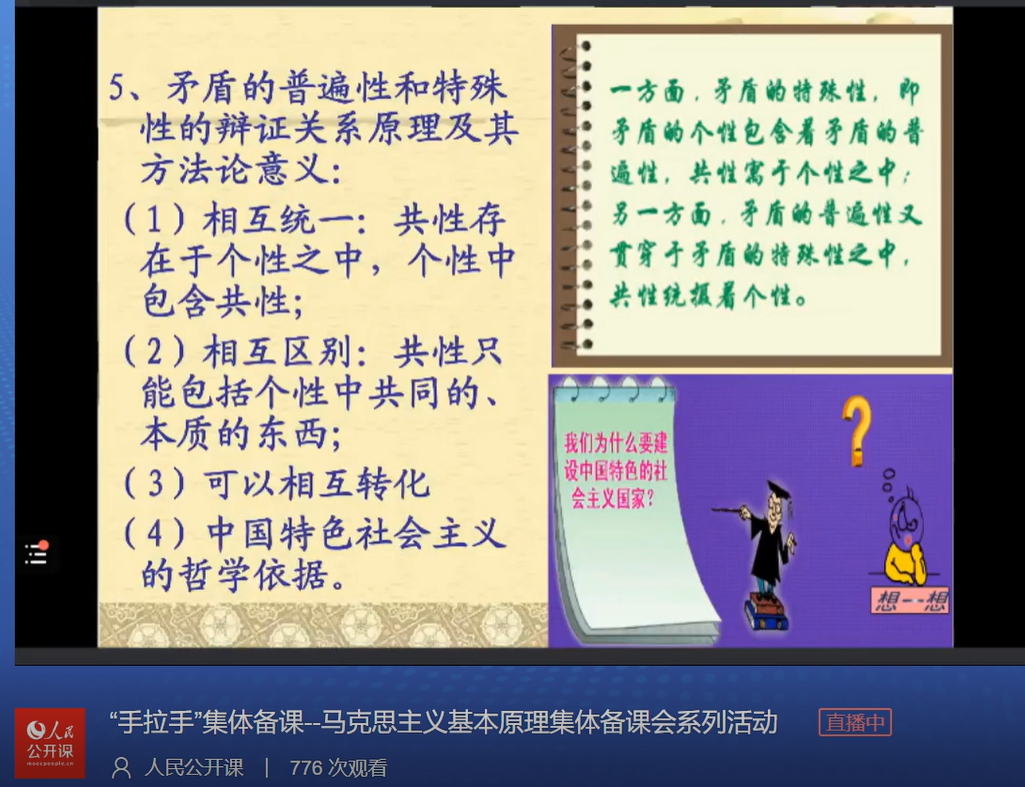 最后,王老师对矛盾的普遍性与特殊性进行了分析。他指出,矛盾的普遍性表现为无处不在、无时不有,矛盾的特殊性表现为具体事物所包含的矛盾及每一矛盾的各个方面都有其特点。矛盾的普遍性和特殊性的辩证关系体现为二者既相互统一又相互区别,且可以相互转化。矛盾的普遍性和特殊性的辩证关系原理既是中国特色社会主义的哲学依据,也是马克思主义的普遍真理同各国的具体实际相结合的哲学基础。21世纪,人类社会的变化将更加具体而深刻,新情况、新问题层出不穷,因此掌握矛盾普遍性和特殊性的辩证关系原理,把马克思主义同本国实际和时代发展相结合,与时俱进,开拓新境界、提出新思路是我们面临的重大课题。