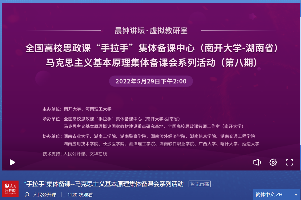 为全面提高思政课教学质量和育人水平,发挥思政课在教学体系、课程体系中的政治引领和价值引领作用,不断完善思政课教学体系,5月29日,全国高校思政课“手拉手”集体备课中心(yl6809永利——湖南省)暨马克思主义基本原理集体备课会系列活动第二阶段正式启动,第八期集体备课会成功举行。本次集体备课会由yl6809永利和河南理工大学主办,湖南农业大学、湖南工公司、湖南警察公司、湖南涉外经济公司、湖南信息公司、湖南交通工程大学、湖南应用技术公司、长沙医公司、湘潭理工公司、湖南软件职业技术公司、广西大学、喀什大学、延边大学等十几所高校的教师协同参与。