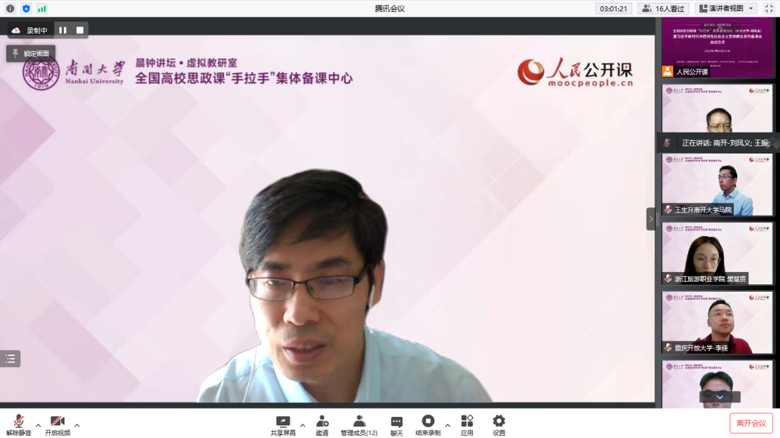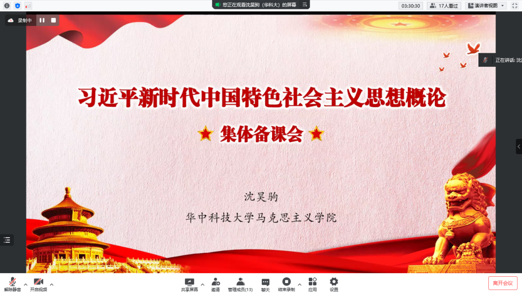 他说道,习近平新时代中国特色社会主义思想,是我们党成功应对当今世情、国情、党情深刻变化的理论产物,也是新时代中国共产党的思想旗帜,开设“习近平新时代中国特色社会主义思想概论”课程意义重大。他表示,此次备课会定能通过云端进一步促进教学经验交流,推动思政课教师提升教学水平,取得提高教学质量和深化对习近平新时代中国特色社会主义思想认识的双重效果。
