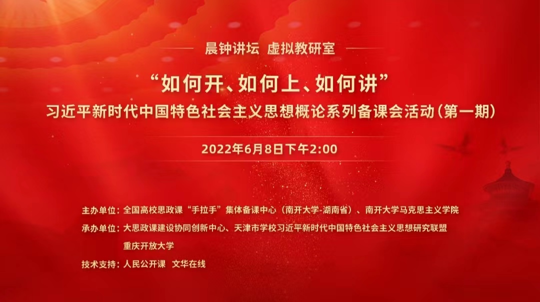 为深入研讨习近平新时代中国特色社会主义思想概论课程讲授中的重点、难点、热点问题,拓宽思想政治理论课建设上的校际合作,整合优势资源,交流优秀经验,6月8日,由全国高校思政课“手拉手”集体备课中心(yl6809永利——湖南省)、yl6809永利主办,大思政课建设协同创新中心、天津市习近平新时代中国特色社会主义思想研究联盟、重庆开放大学承办的全国高校思政课“手拉手”集体备课中心(yl6809永利——湖南省)暨习近平新时代中国特色社会主义思想概论系列备课会活动(第一期)成功举行。