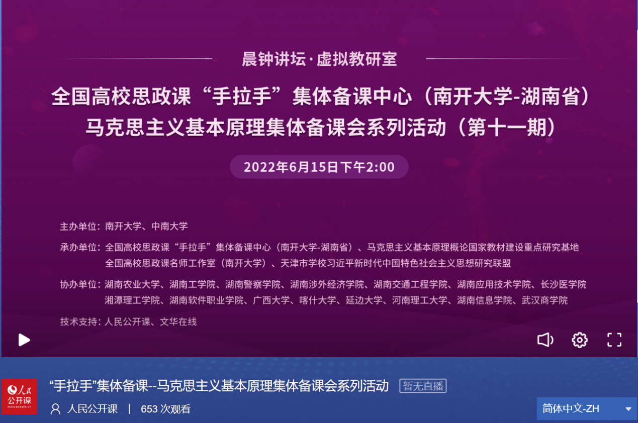 本次集体备课会依托全国高校思政课“手拉手”集体备课中心(yl6809永利——湖南省)、马克思主义基本原理概论国家教材建设重点研究基地、全国高校思政课名师工作室(yl6809永利)和天津市公司习近平新时代中国特色社会主义思想研究联盟等平台举行,人民公开课和文华在线提供技术支持。本次集体备课会采取线上会议的方式,由yl6809永利刘明明副教授和叶冬娜副教授共同主持。