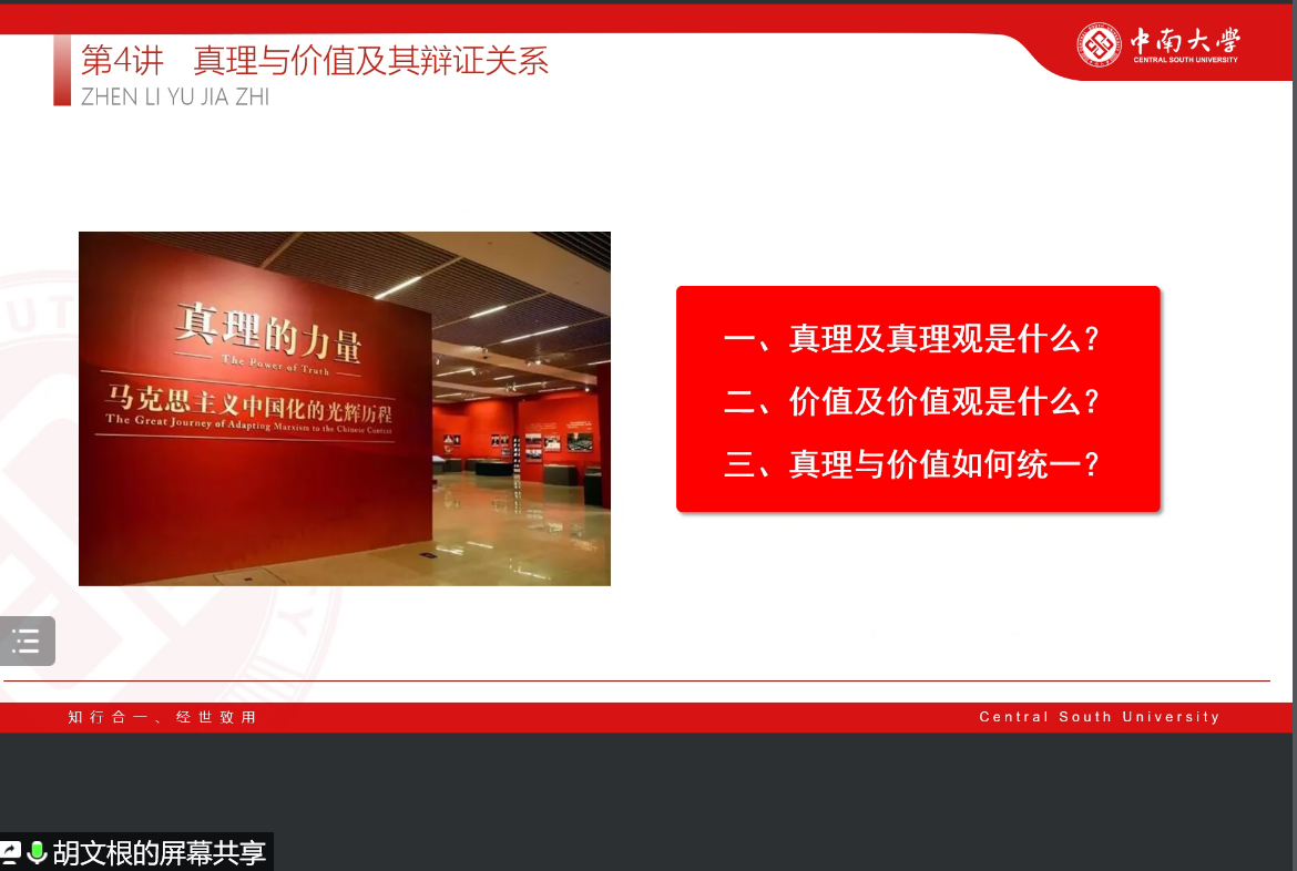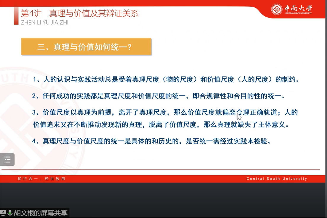 关于“如何从价值性认识当中理解对真理的追求”,胡老师指出,通常会让员工们对这一问题进行讨论,而讨论的落脚点就是本讲的最后部分内容,即真理与价值如何实现统一。胡老师指出,人的认识与实践活动总受到真理尺度(物的尺度)和价值尺度(人的尺度)的制约,任何成功的实践都是真理尺度和价值尺度的统一。结合现实,以疫情防控为例,胡老师指出,我国在疫情防控中取得积极成果的背后,有科技工作者和医务工作者研发疫苗和药物,这符合真理尺度;同时疫情防控保障了国民生命财产健康安全,为构建美丽中国、健康中国做出了贡献,也满足了人民群众的主体需要,这符合价值尺度。