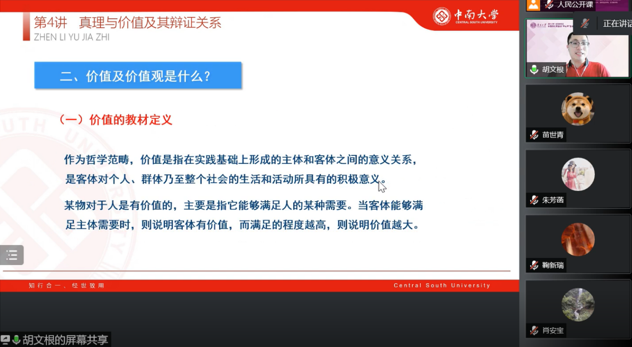 关于“价值及价值观”,胡老师指出,价值是在实践基础上形成的主体和客体之间的意义关系,是客体对个人、群体乃至整个社会的生活和活动所具有的积极意义。他对价值的基本特性,即价值的主体性、客体性、多维性和历史性做了简要分析。在价值评价方面,胡老师指出,价值评价是主体对客体的价值及价值大小所作的评判或判断,他强调这部分内容是价值讲授中的重点内容。价值评价有科学与非科学之分,科学的价值评价是客观公正、全面有效的评价,而非科学的价值评价则是歪曲、遮蔽客观价值关系的一种评价。尽管价值评价是一种主观性活动,但绝不是随意性的活动,应当以真理为依据,做出有利于人类整体社会生存和发展进步的判断。探寻符合全人类利益的发展之路,归根结底是要以社会的进步和人类的解放作为价值判断的标准。在价值观的讲解中,胡老师指出,价值观是人们关于应该做什么和不应该做什么的基本观点,是区分好坏、对错、善恶、美丑等的总观点。核心价值观是为社会共同体普遍认可的、用以评价是非曲直的价值标准,反映出全体人民共同的价值追求。胡老师强调,核心价值观是一种积极正向的价值引导。