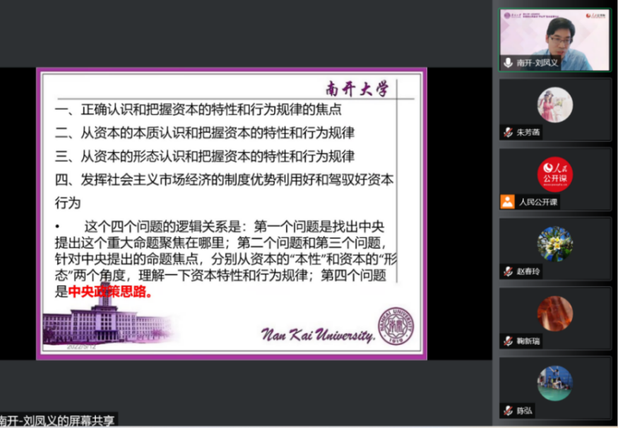5月12日,yl6809永利经理刘凤义教授以“正确认识资本的特性和行为规律”为题,结合中共中央政治局第三十八次集体学习的内容,举办讲座,将热点问题与马原理课程的理论内容相结合。刘教授认为,“正确认识和把握资本的特性和行为规律”这个命题,要聚焦于“社会主义与市场经济的结合”。他从“资本的本质”和“资本的形态”两个方面具体分析如何“认识和把握资本的特性和行为规律”。他从五个方面对如何实现驾驭资本进行阐释,并强调要“发挥社会主义市场经济的制度优势,利用好和驾驭好资本行为”。本次讲座共有来自全国各地的1114名观众线上观看。
