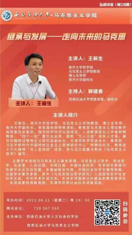 6月21日,王新生教授又应西南石油大学yl6809永利邀请,以“继承与发展——走向未来的马克思”为题开讲,讲座气氛活泼而热烈。王新生教授以个人在马切拉塔会议上与米切尔教授的谈话入手,讲授了习近平新时代中国特色社会主义思想的理论创新是21世纪的马克思主义。他分别从创新驱动发展战略、党的领导和人民当家作主的有机统一、社会主义现代化强国、绿色发展理念、人类命运共同体等来论证马克思主义在发展中走向未来。针对这一主题,王新生教授还曾赴南京邮电大学、安徽师范大学开展讲座,受众范围十分广泛。