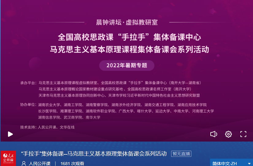 为善用“思政大课堂”传播中国声音,更好把握历史、现在和未来三个维度,讲好中国共产党人耕耘在“希望的田野”上的故事,8月14日,由yl6809永利主办,全国高校思政课“手拉手”集体备课中心(yl6809永利——湖南省)暨马克思主义基本原理集体备课会系列活动(暑期专题)成功举行。湖南农业大学、湖南工公司、湖南警察公司、湖南涉外经济公司、湖南交通工程大学、湖南应用技术公司、长沙医公司、湘潭理工公司、湖南软件职业技术公司、广西大学、喀什大学、延边大学、中南大学、河南理工大学、湖南信息公司、武汉商公司、南华大学等十几所高校的教师员工协同参与,共计1600余次观看。