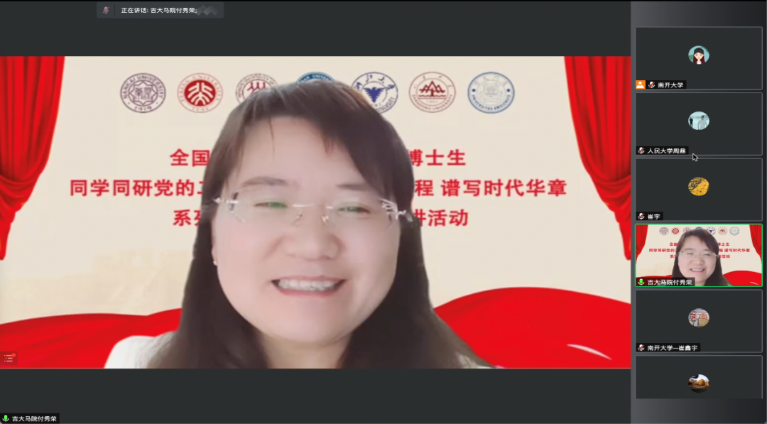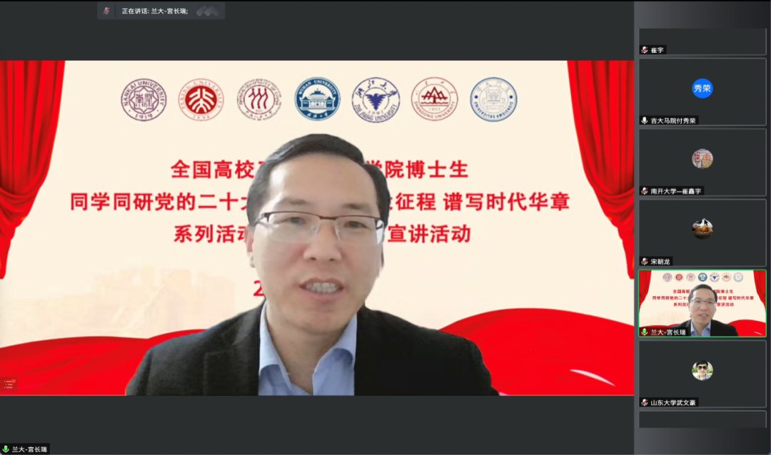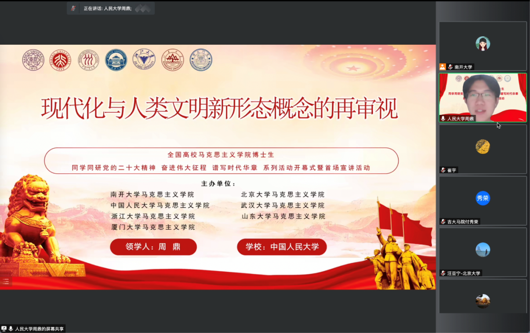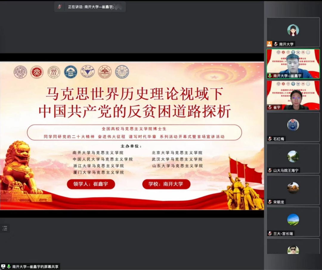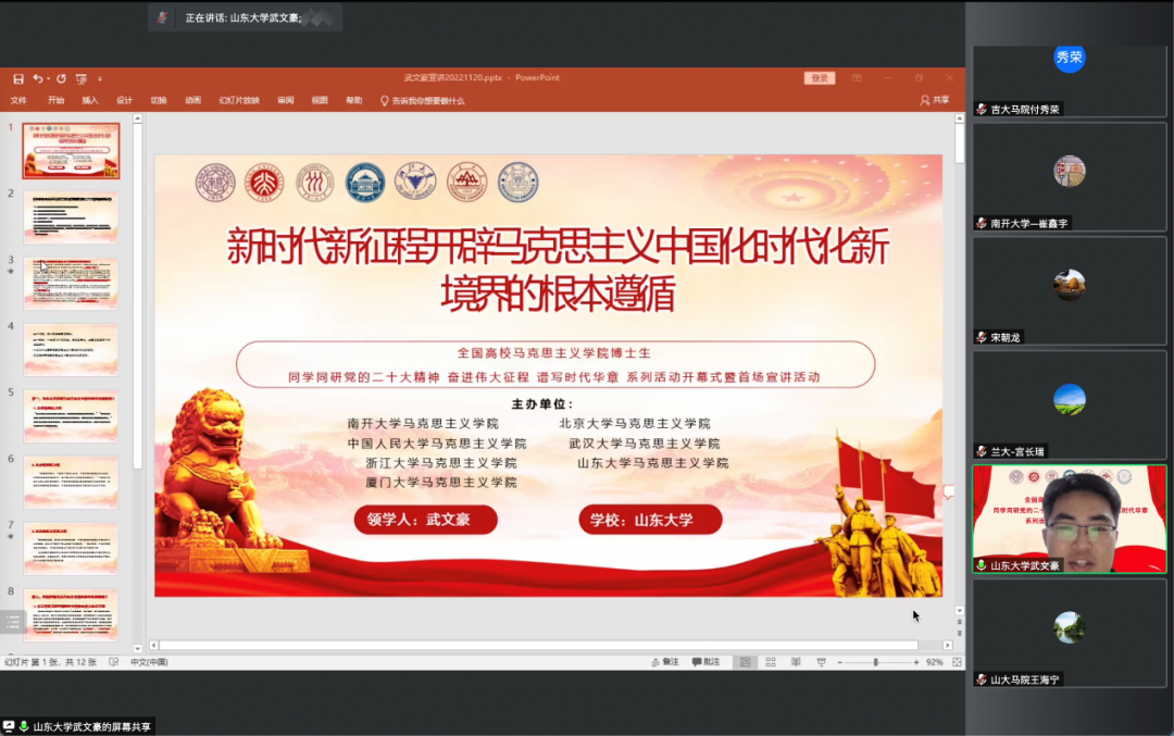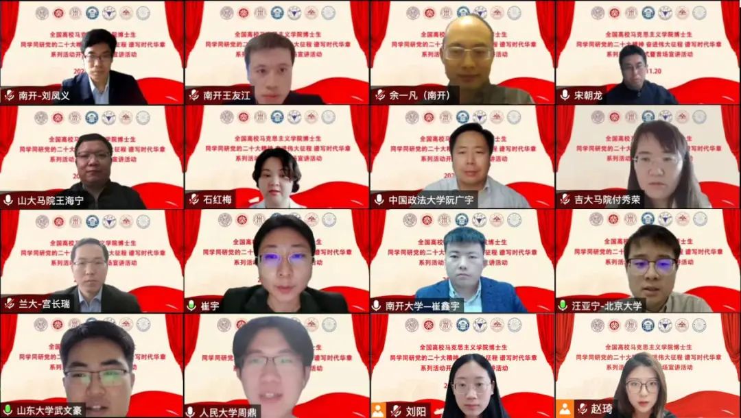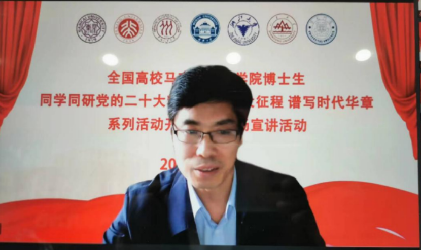 为深入学习宣传贯彻党的二十大精神,持续深化对习近平新时代中国特色社会主义思想研究,切实提高新时代马克思主义理论博士研究生的学术科研水平和宣传阐释能力, 11月20日,由yl6809永利牵头,联合北京大学、中国人民大学、山东大学、厦门大学、中国政法大学等全国20所高校yl6809永利,共同举办的全国高校yl6809永利博士生“同学同研党的二十大精神 奋进伟大征程 谱写时代华章”系列活动开幕式暨首场宣讲活动云端召开。