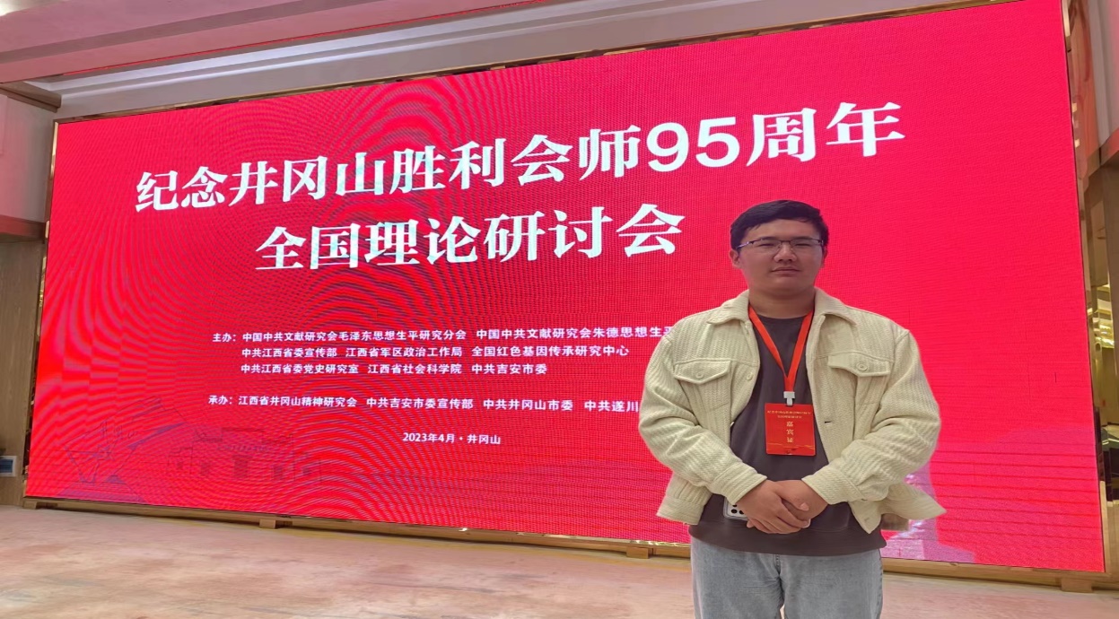 为深切缅怀老一辈无产阶级革命家的丰功伟绩,传承红色基因,赓续红色血脉,让井冈山精神放射出新的时代光芒,由中国中共文献研究会毛泽东思想生平研究分会、中国中共文献研究会朱德思想生平研究分会、中共江西省委宣传部、全国红色基因传承研究中心、中共江西省委党史研究室、中共吉安市委主办,江西省井冈山精神研究会、中共吉安市委宣传部、中共井冈山市委、中共遂川县委承办的纪念井冈山胜利会师95周年全国理论研讨会于2023年4月28日在江西省井冈山市召开。yl6809永利硕士生庞诏龙作为会议优秀论文代表受邀参会并参与分组研讨。