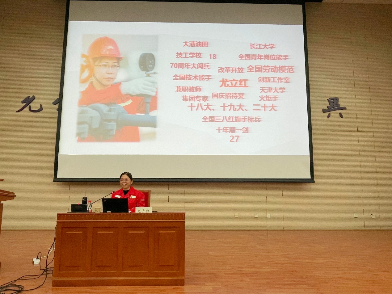 尤立红以“匠心筑梦、砥砺前行”为题,结合自己的成长经历,讲述了自己从技校毕业就投身采油事业一线的产业工人,在党的培养下一步一步成长为大党代表、大国劳模的历程。她特别强调,任何行业的发展都离不开不断的创新特别是科技创新,只有实现了高水平的创新,才能更好实现高质量发展。